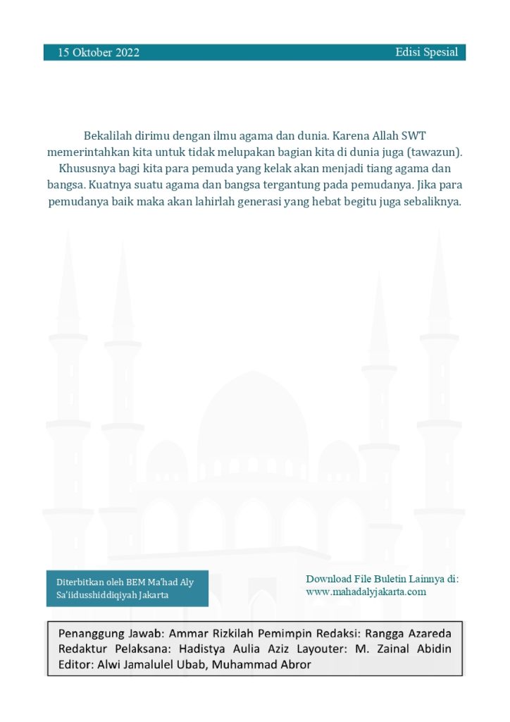 Buletin ATSARUNA EDISI SPESIAL MAULID XVII October 15, 2022 Ma'had Aly Jakarta بِسْــــــــــــــــــمِ اللهِ الرَّحْمَنِ الرَّحِيْمِ BULETIN FORMAT PDF Post Views: 788