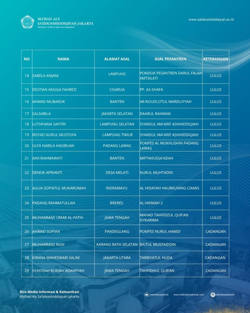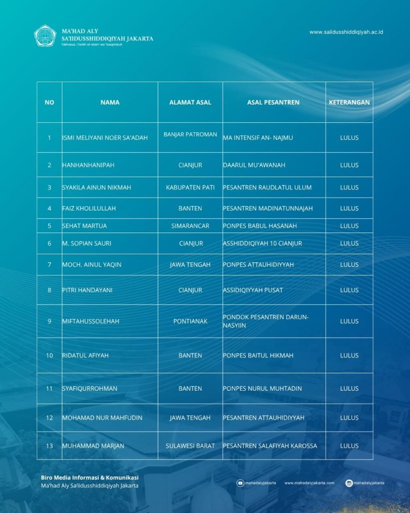 Berdasar rapat, terpilih 25 peserta lolos seleksi Gelombang I dan Gelombang II Ma’had Aly Sa’iidusshiddiqi’yah Jakarta yang akan disahkan sebagai mahasantri baru. Berikut nama-namanya antara lain: